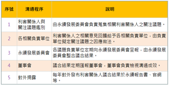 為了瞭解及回應利害關係人關注的事項,我們提供各類溝通管道與利害關係人定期溝通與議合,讓利害關係人能夠隨時提出意見,以瞭解不同利害關係人所關心的ESG議題,並給予回應或相關問題之因應策略。2024年各利害關係人溝通機制及關注議題彙整如下:亞元科技利害關係人溝通機制與管理程序