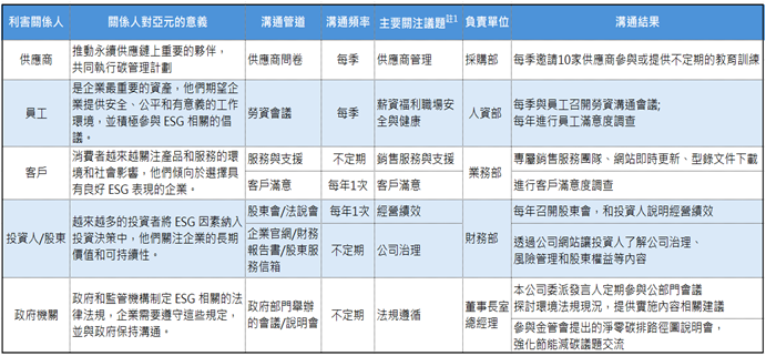 亞元科技考量公司行業屬性及營運模式,由永續發展委員會參考AA1000 SES利害關係人議合標準(2015)(Stakeholder Engagement Standard, AA1000 SES 2015)」的五大原則:依賴程度(Dependency)、責任度(Responsibility)、急迫性(Tension)、影響力(Influence)及多元觀點(Diverse Perspectives),判斷對亞元科技具有影響性及受亞元科技影響的團體或組織。經鑑別與本公司直接相關的利害關係人共5類,包含供應商、員工、客戶、投資人/股東及政府機關。
